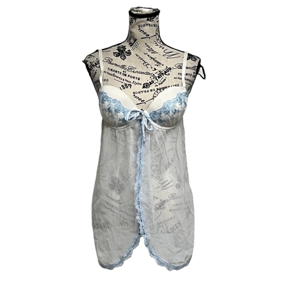 Romantic and ethereal, this vintage-inspired APT. 9 sheer babydoll blouse captures the essence of Y2K and coastal femininity. Designed with delicate blue lace trim and embroidered cups, it features a sheer mesh body with a front tie closure and adjustable spaghetti straps. Perfect for layering as a statement top or styled as a flirty lingerie-inspired blouse for boho, coquette, or beachy aesthetics.
