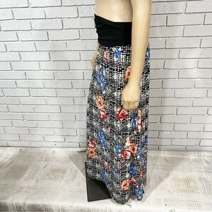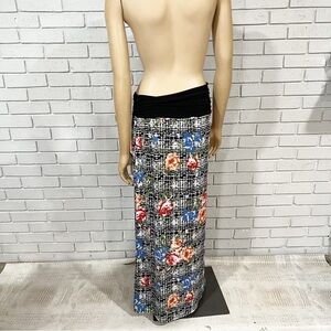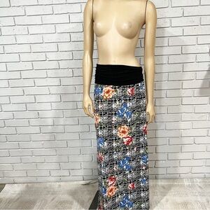 Gently used skirt. 95% Polyester, 5% Spandex. Black Color with Red-Orange, Blue and Green Colors Flowers Print on Black and White Brick Like Pattern. No Lining, Flowing Fabric, Pull On Skirt.