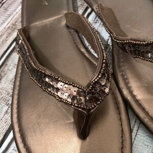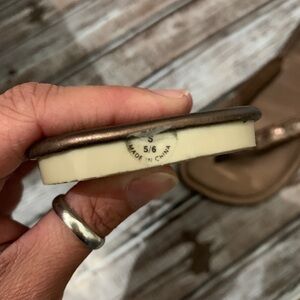 Apt 9 sandals size small 5/6 in excellent condition worn only one time, small flaw on the tip of sandals please see all pictures for details. Color is a metallic Brown