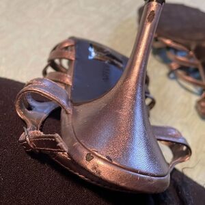 These belonged to my daughter and have been worn a few times. There are some minor scuffs on the back of the heels where they scrubbed against concrete steps and also a little crack in the finish under the toes. These are not apparent when wearing and looking down at the shoes, and I zoomed in so you could see in the photos. They are great shoes and it is difficult to find this Pewter color.