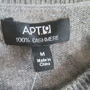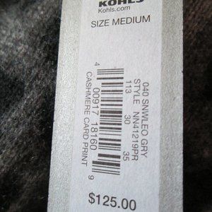 A Brand New Never Worn, with original tags APT.9 made for Kohl's $125 Gray & Black Animal Print 100% Cashmere Nine Button Cardigan Sweater in size Medium, from smoke & pet-free home. This is quite a soft luxurious fabric from: The cold windy steppe of Inner Mongolia is home to the tribes of proud nomads. It's also the source of the world's most luxurious fiber. This garment is made from the soft winter growth of hair carefully combed each spring from the fleece of the Mongolian goats. Carefully spun & dyed, these exceptionally soft but durable yarns have been expertly crafted into the finest of today's cashmere items. This is quite versatile, wear with jeans, slacks, casual pants or skirts or shorts. This sweater will really take you from daytime to an evening out with just the right styling. Made in China of 100% Cashmere, so this is a Dry Clean or if careful you can Hand Wash separately in cold water, DO Not use any bleach as needed, Do not wring or twist, reshape lay flat to dry & steam iron if needed. Sweater measures 36" around bustline, with plenty of stretch, 23" in length from bottom of the neck to the bottom of the hem.
