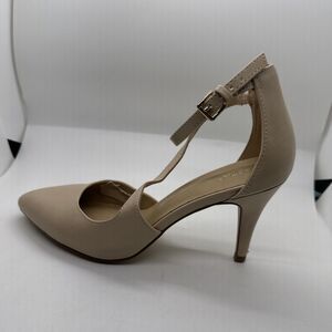 These Apt. 9 Defined Comfort heels are in a size 8.5 with a closed toe and asymmetrical strap design. They feature a kitten heel style and a strappy buckle closure. The color is beige, and they are suitable for occasions like weddings, parties, or formal events. The upper, lining, insole, and outsole materials are man-made for comfort. Made in China.