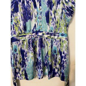 APT.9 TOP BACK TIE BANDED FRONT WAIST BUSINESS WORK TRAVEL WATERCOLOR SILKY L. EMPIRE BANDED WAIST TIES IN BACK. SMALL PEARL SHAPED SELF FABRIC COVERED FASTENS THROUGH SELF FABRIC LOOPS. NECK HAS SMALL 1" SELF FABRIC RUFFLE. WATERCOLOR BLUES, GREENS AND WHITE PRINT. SILKY, COMFORTABLE, EASY CARE.