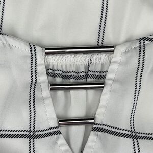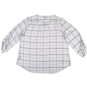 The relaxed-fit tunic style is designed in a crisp white color, accented with delicate hardware that adds a touch of elegance. Its lightweight chiffon fabric, coupled with long roll-tab sleeves, offers a comfortable and flowing silhouette ideal for fall, spring, and summer. The blouse features a chic V-neckline and a plaid pattern that exudes a classic yet bohemian vibe. Machine washable for easy care, this blouse is made from soft polyester and is a single unit addition to your collection. There are 2 small spots and a small snag on the front. Measures a 48' chest and is about 28" long. Please be aware that due to its fabric type, this item may attract lint or hair. It will be shipping from a smoke-free, pet-friendly environment. While we strive to ensure that all items are clean and in excellent condition before shipping, some residual lint or hair may be present. We recommend using a lint roller or brush to maintain the item's appearance. I appreciate your understanding