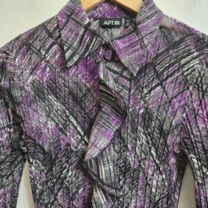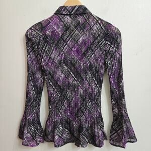 Y2K, Ruffle Front, Fitted, Petite, Abstract Print, Long Sleeve, Lightweight, Layering Top, Button Down, Purple Blouse