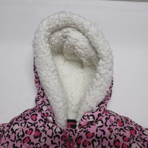 Cute puffer coat, jacket with a leopard-like heart print pattern.