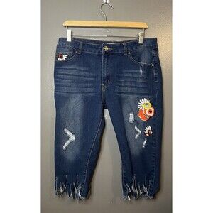 AQ Jeans Floral Embroidered Stretch Fringed Jorts Denim Size 15 Waist 34”