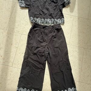 Elegant black top and pants set with intricate white embroidery. Perfect for any occasion.