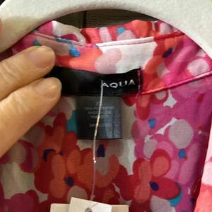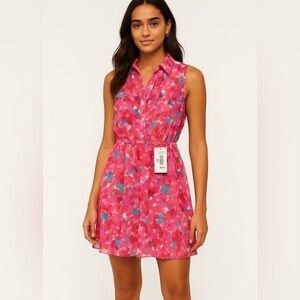 Fresh and feminine, this AQUA from Bloomingdale’s mini dress is perfect for warm weather, brunch, or a casual party. Crafted in lightweight chiffon, it features a vibrant floral print with pink as the base color. The sleeveless design, collared neckline, and elastic waist make it both flattering and comfortable.