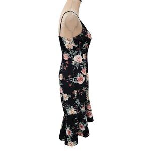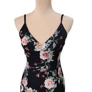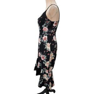 AQUA Bloomingdales Size M Black with Floral Form Fitting HIgh-Low Hem Dress