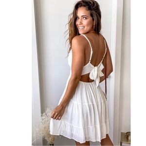 We are absolutely in love with this prettiest-ever ivory mini dress featuring a beautiful crochet top and a sweet self-tie back! The perfect little dress for summer — effortless, feminine, and boho-chic.