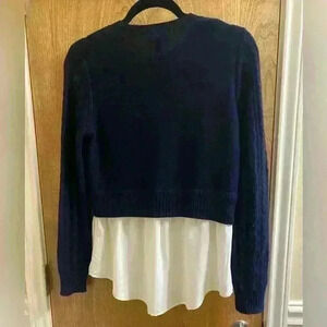 AQUA Cashmere Navy Knit Sweater with White Built-in Button Undershirt Size S