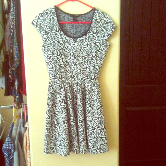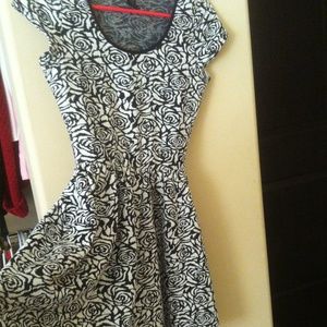 Black and white dress with rose designs. The brand is Aqua, purchased from Bloomingdales. Flares out at the bottom, tighter in bust area.