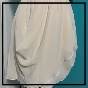 This lace draped chiffon dress features full lining, lace top, chiffon skirt, spaghetti straps, padded bust, side boning, inseam pockets & concealed back zipper closure w/ hook & eye. Bust also has hook & eye w/ 2 adjustments. Bodice: 50% Cotton, 30% Nylon, 20% Viscose. Skirt: 100% Polyester. Lining: 96% Polyester, 4% Elastane. Dry Clean. NWT but has 1 small mark on back barely noticeable see last pic. Measures approx: 15” armpit to armpit, 25” armpit to hem. Rubber around top to keep in place.