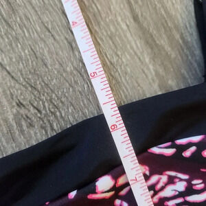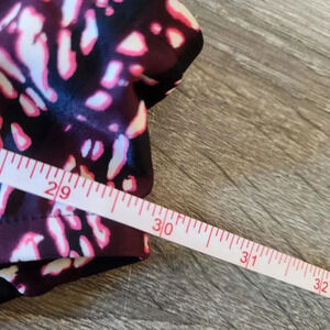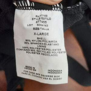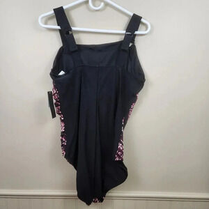 Women's NWT new with tags Aqua Green one-piece swimsuit, size XL Extra Large (16/18). Swimsuit features wide straps with asymetrical chestline, decorative geometric piece on one of the straps, flattering diagonal pattern, and adjustable straps. Swimsuit has a pink/maroon geometric diagonal wave pattern on the front and is solid black on the back. Measurements are approximately 5.5" to the neckline, 30" in length and 17.5" bust. Material content is 80% nylon/20% spandex (lining) 100% polyester.