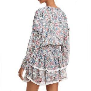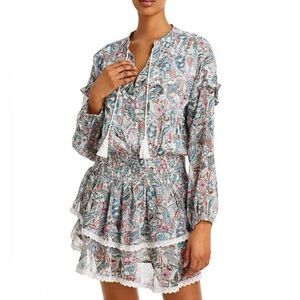 AQUA Paisley Smocked Waist Crochet Trim Tiered Mini Dress White Ivory Small