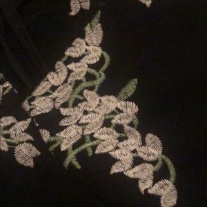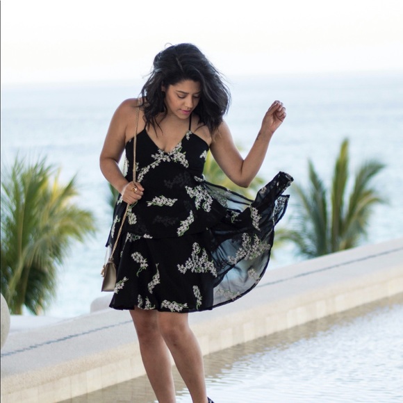 Only worn once on a trip. Black sheer material with lining. Embroidered details. Criss cross back. Low cut in front. Ruffle tiers. Adjustable straps.