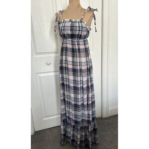 AQUA for Bloomingdale's Navy Pink Plaid Pull-Over Tie Up Shoulder Maxi Dress