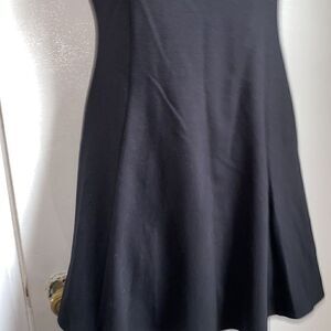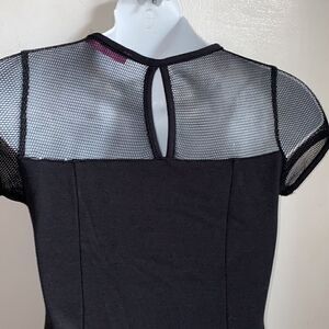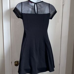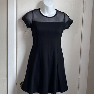 Washable polyester black stretch fit and flare dress with black mesh yoke and cap sleeves, crew neck with keyhole back detail. Size Large, measures 14” from armpit to armpit and 36” from top of shoulder to bottom hem.