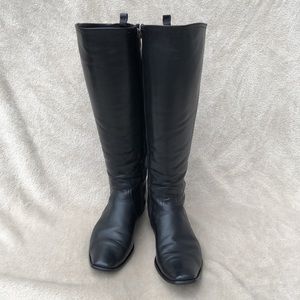 Aquatalia, made of fine Italian leather, is considered an all weather boot. A classic knee high boot with a squared almond toe & elastic insets at rear seam. Interior has a padded fabric lining for comfort & warmth. Marked a size 7.5 & I found it to be true to size. Measures approximately 16” to knee but 15” tall to calf due to shaft taper & 7.25” across widest part of shaft, but doesn’t include extension of elastic. Please see photos for good as-is well loved condition. These have just been conditioned for sale.