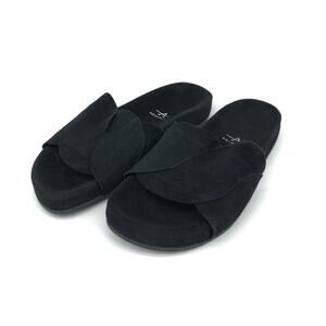 Aquatalia Ivey Suede Leather Slide Sandals in black. Layered fabric toe strap. Suede outer and upper, rubber sole. Like new!