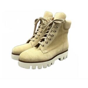 A weatherproof suede bootie with a crepe rubber wedge and top-stitch welt. Chukka style in Olive Green. Cushioned fabric lining. Leather insole. Made in Italy. Retail: $395.