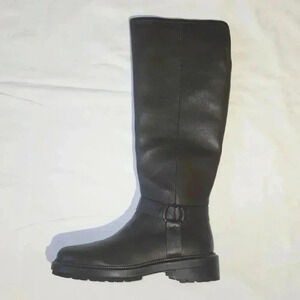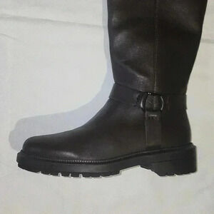 calf weatherproof leather boot with harness and dark metal tone hardware Buckle accent