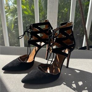 AQUAZZURA Belgravia Lattice CAGED Suede Pointed Toe Black Pumps