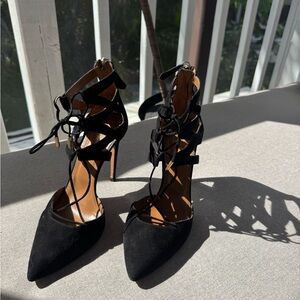 Designed with suede into pointed toes, these Belgravia black heels have a lace-up design around the ankles, zippers on the counters and 4” heels that balance the pair for a comfortable walk. These pumps from Aquazzura are unique and breathtaking to own.