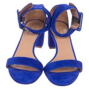 Cobalt suede Aquazzura sandals with covered heels and buckle closure at ankles.