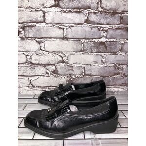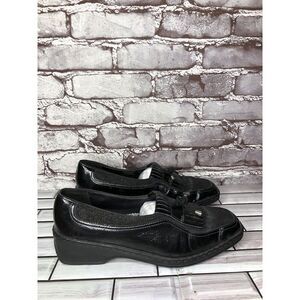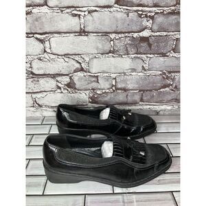 Elevate your shoe game with these stylish and versatile ARA Naturform wedge shoes. Crafted in Germany from high-quality leather, these slip-on shoes feature a croco embossed pattern, fringe accents, and a kiltie bow for a touch of sophistication. The adjustable strap and lace-up closure ensure a comfortable fit, while the cushioned insole and rubber outsole provide all-day comfort and performance. Perfect for casual wear or workwear, these shoes come in a classic black color and are available in women's US shoe size 7.5 and UK shoe size 6.