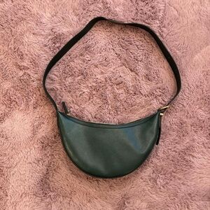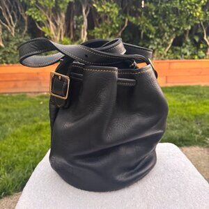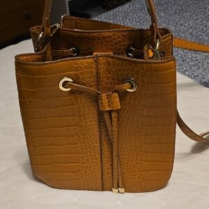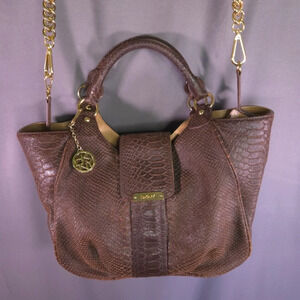 Arahoe is a unique leather design company specializing in Western accessories and apparel. This beautifully rugged piece is crafted with love in distressed croc-embossed leather. On the front are three chunky slabs of brilliant genuine turquoise. Brushed brass kisslock closure and hinged hardframe combine to blend funky urban with traditional Western. End panels are calf hair. Leather shoulder strap is suede-lined to prevent slipping - a very nice touch. Well-designed and made. Retail: $400.