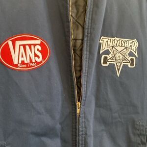 ARAMARK Men’s Full Zip Quilted Lined Navy Jacket in excellent used condition. Hem measures about 20” lying flat and fully stretched. Would most likely fit a medium. Vans and Thrasher patches appear to have been added on the jacket. Please ask questions if any. Price offered reflects this issue. Thanks.