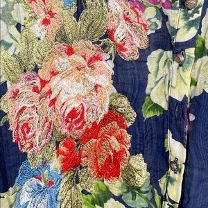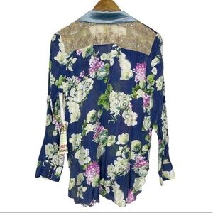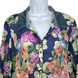 Aratta Silent Journey Embroidered Floral Button-Down Shirt. In the color Night Blue. A multi-color all over floral print. Floral embroidered detail on front. High low scallop hem. Velvet collar. Long roll tab sleeves. Sequin mesh back yoke. Lightweight material. Model pics are same style but different color, for reference only.
