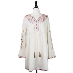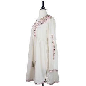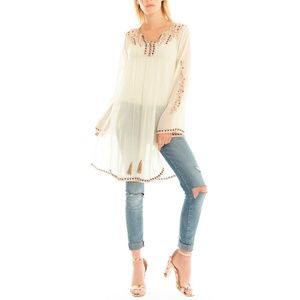 Semi-sheer cotton tunic top in pearly beige with pink and tan embroidery, long sleeves with bell cuff, side slits, split neckline with tie-closure.
