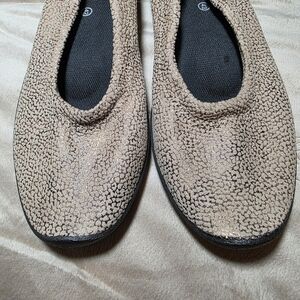 Cozy and stylish soft knit ballet flats. Textured tan with gold metallic background design on upper, that is buttery soft. Ideal for both everyday wear, home comfort, and travel. Very supportive footbed.