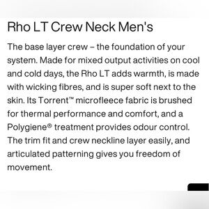The base layer crew - the foundation of your system. Made for mixed output activities on cool and cold days, the Rho LT Crew adds warmth, is made with wicking fibres, and is super soft next to the skin. Its Torrent™M microfleece fabric is brushed for thermal performance and comfort, and a Polygiene® treatment provides odour control. The trim fit and crew neckline layers easily, and articulated patterning gives you freedom of movement.
