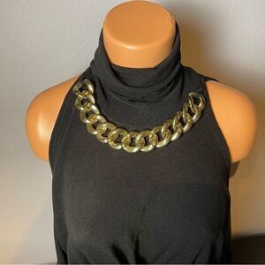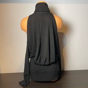 Gently worn black knit turtleneck with open shoulder long sleeves. Attached gold necklace.