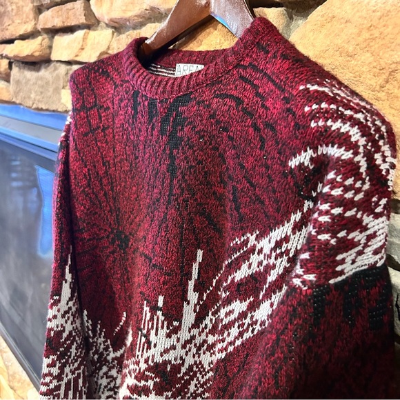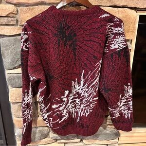 Chic knit sweater by AREA. Features a bold red and black design. Ideal for stylish layering. Size large under arm to under arm measurement 22 inches. Top of bottom shirt 24 inches. (151)