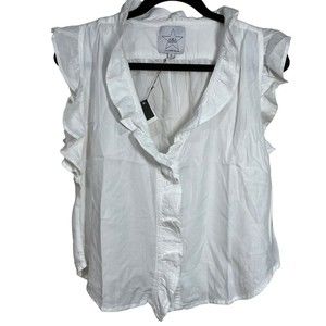 White ruffle top has a button down front, which is covered by ruffles, ruffle cap sleeves, v neck and is made of viscose. Measurement s are in the pictures
