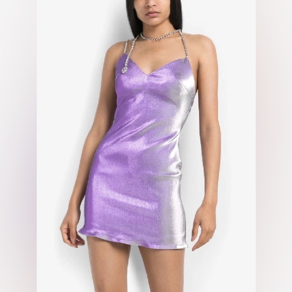 AREA crystal choker mini dress in silver violet. Iridescent color shifting fabric that looks different in different light. Crystal embellished shoulder strap with wrap around neck detail and purple charm accent. Metallic threading effect throughout. Slight ruffle to hem. Hidden back zip closure. Note: there is only one strap to the dress. The chain wraps around the neck to hold the other side up. In excellent condition. Size xs.