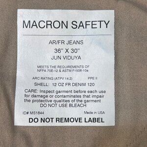 AR/FR Macron Safety 12 Oz Denim Jeans 36 X 30 OSHA COMP Flame Resistant Made USA