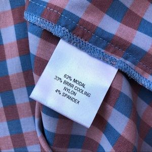 Beautiful blue-burgundy check top with a draped gathering detail on front. Crew neckline, zipper closure, lightweight cool smooth fabric, unlined.