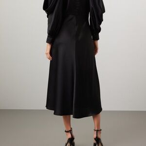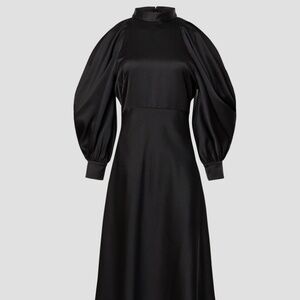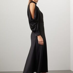 Black crepe (100% Polyester). A-line. Long sleeves. Off the shoulder. Back zipper closure. 50" from shoulder to hemline. Made in the USA of imported fabric.
