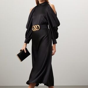 Elevate your evening look with this mock neck LBD by ARIAS NEW YORK, featuring a chic cold shoulder design and monochrome look that showcases a statement belt.