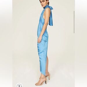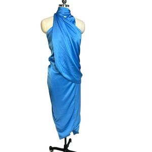 Gorgeous silky satin draped midi cocktail dress. Mock neck, back bow, asymmetric tulip skirt, side zipper, fully lined. Please see small hole in pics measuring smaller than ½ centimeter and barely noticeable. Sleeveless. Halter neck. Back zipper closure. 53.5" from shoulder to hemline. The color is slightly darker than cover picture.