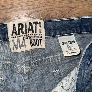 These Ariat bootcut jeans in a rich blue hue offer a timeless look with their medium to dark wash and authentic fading. Crafted from high-quality denim, they provide both comfort and durability, making them perfect for everyday wear.