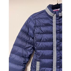 Very lightweight but warm, packable down jacket. Sporty design in navy with white accent stripes around the neck, placket and waistband. Gingham lining. Front pockets and two inner pockets. Down filled.