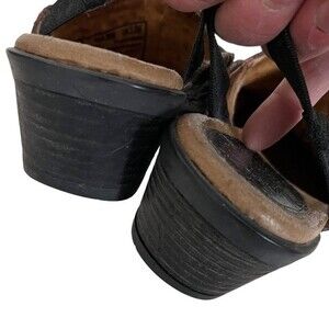 A slip on mule, western clog, maybe. Featuring western stitching with raised red pattern. Snip, toe, and elastic strap around ankle. There is a slight gap on one of the Stacked Heels rubber soul, but does not seem to affect wear. As you know. Ariat is very well-made and will last forever.