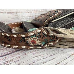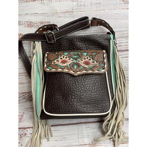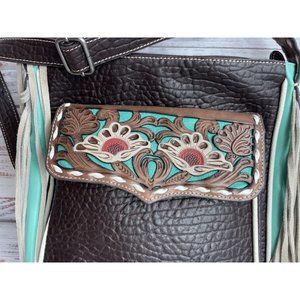 Ariat Monroe crossbody bag. Brown geniuine leather with front flap over pocket with shimmery turquoise underlay and flower tooled cutout overlay.